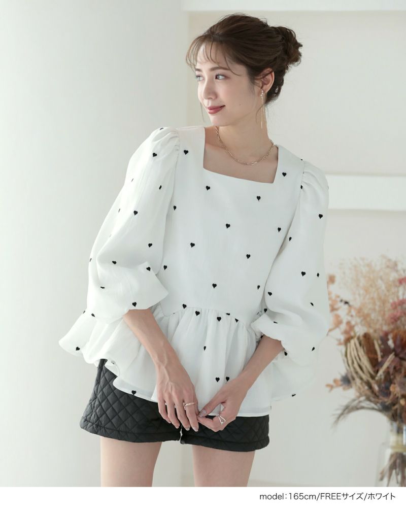 ハートトップス ハート柄 ボリューム袖 裾フレア ペプラム ブラウス 長袖 トップス レディース 秋 冬【m739】【予約販売】【送料無料】メ込